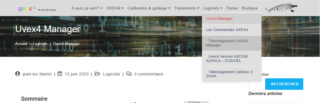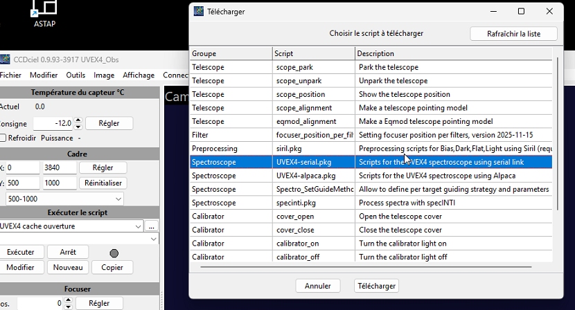 Il suffit d’installer « UVEX4_serial » et « UVEX4_alpaca » depuis le menu CCDCiel « Modifier/installer des scripts ».