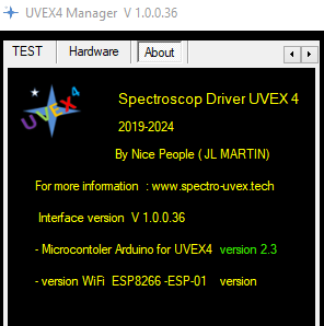 Vérifier votre version de l’ARDUINO dans l’onglet About de l’UVEX4 Manager. Si ce n’est pas la bonne version , allez dans l’onglet Setup2 et cliquer sur le bouton Arduino Update.